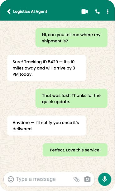 Now, Carlos messages the Logistics Virtual Agent on WhatsApp. Within seconds, it retrieves his tracking ID, checks GPS data, and sends an ETA update.