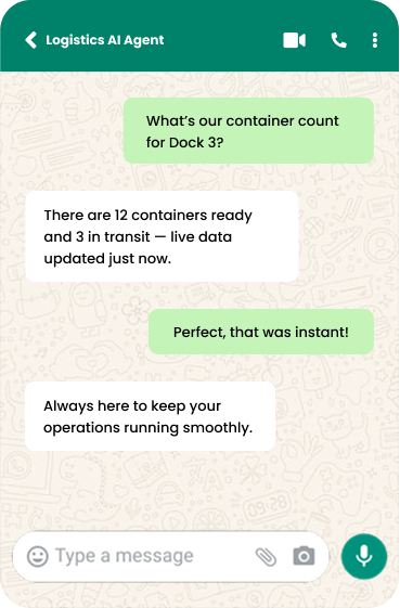 Now, she simply asks the Logistics Virtual Agent, “What’s our container count for Dock 3?” It responds instantly, pulling live data from the WMS.