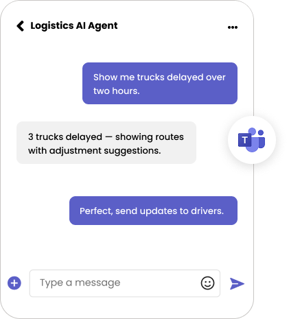 A dispatcher asks, “Show me trucks delayed over two hours.” — it displays them with suggested route adjustments